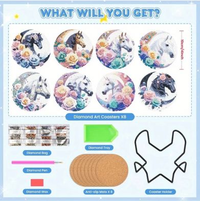 Diamond Art Coaster kits are craft kits, ideal for children and adults, which enable you to make your own sparkly and beautiful diamond coaster. The technique is similar to painting by numbers. Each diamond keyring design has a numbered, adhesive template. Using the drill pen (included), simply lift up the coloured drills and place them on the corresponding numbered dots. They affix instantly! The technique is relaxing and therapeutic, and the result is a beautiful piece of rhinestone art which you can gift to loved ones. Making a coaster takes 30-45 minutes. They are suitable for ages 6 and up.
