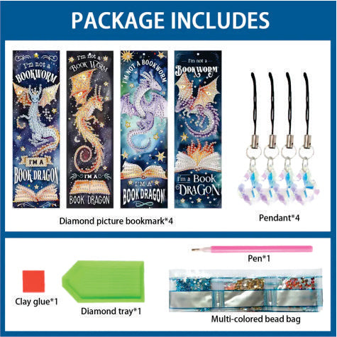 Diamond Art bookmark kit is a craft kit, ideal for children and adults, which enable you to make your own sparkly and beautiful diamond keyring. The technique is similar to painting by numbers. Each diamond bookmark design has a numbered, adhesive template. Using the drill pen (included), simply lift up the coloured drills and place them on the corresponding numbered dots. They affix instantly! The technique is relaxing and therapeutic, and the result is a beautiful piece of rhinestone art which you can gift to loved ones. Making a book takes 30-45 minutes. They are suitable for ages 6 and up.